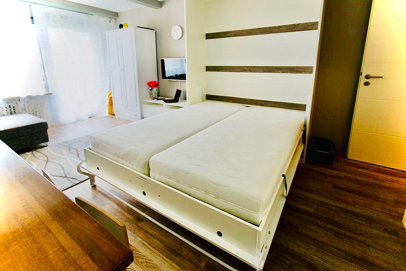 Wohnzimmer mit 180 cm Schrankbett & TV – Balkon mit Bergblick