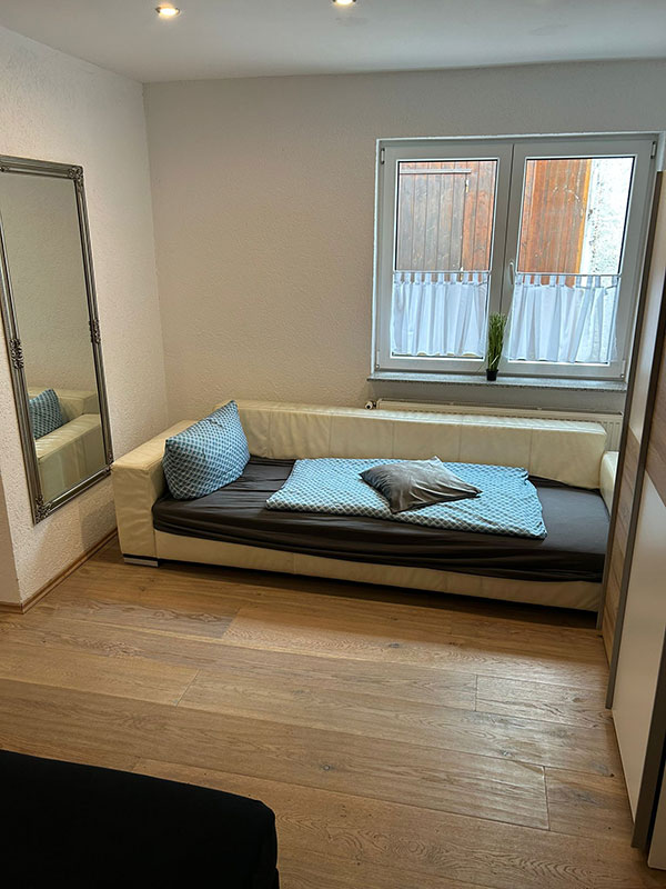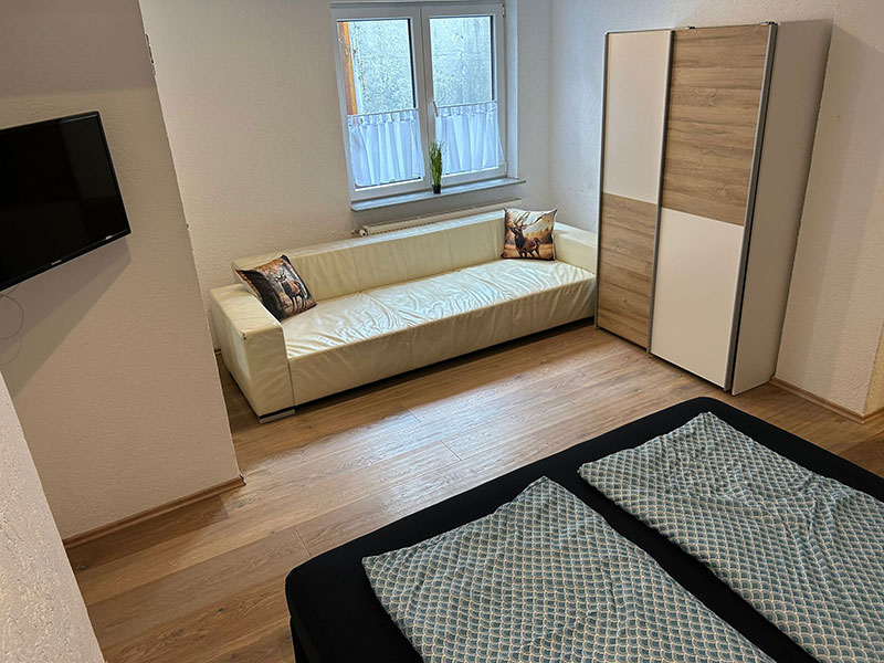 Genießen Sie erholsame Nächte in zwei stilvoll eingerichteten Schlafzimmern, ausgestattet mit komfortablen Boxspringbetten und jeweils eigenem TV. Hier verbinden sich Ruhe, Komfort und modernes Design für Ihren perfekten Schlaf.