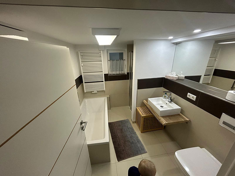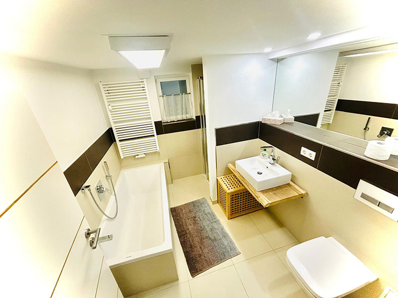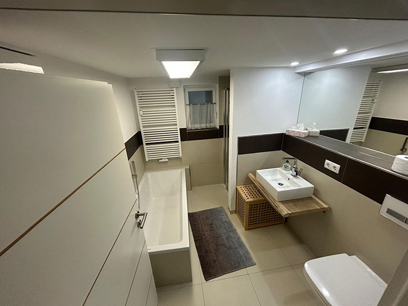 Das Bad verfügt über Badewanne und separate Dusche und überzeugt mit zeitgemäßem Design sowie hochwertigen Armaturen – für einen entspannten Start in den Tag oder erholsame Wellnessmomente.